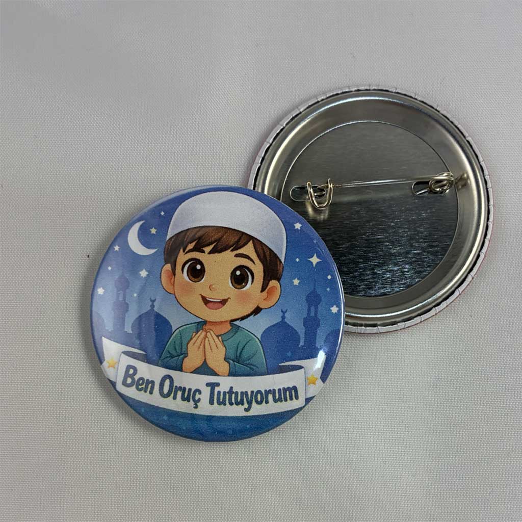 Bu ben oruç tutuyorum erkek rozet modeli, dayanıklı metal gövde üzerine üretilir ve ön yüzeyinde parlak koruyucu kaplama bulunur. Bu kaplama, baskının canlı görünmesini sağlar ve çizilmelere karşı ekstra dayanıklılık sunar. Ramazan temalı tasarım, çocukların ilgisini çekecek renkler ve figürler ile hazırlanmıştır.