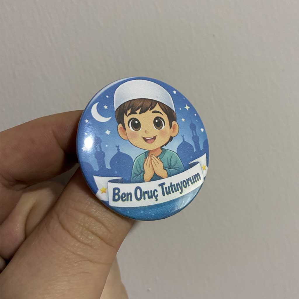 Ben oruç tutuyorum erkek rozet, Ramazan ayında çocukların oruç heyecanını paylaşmaları için özel olarak tasarlanmış anlamlı bir üründür. 44mm boyutundaki bu rozet, hem dikkat çekici hem de günlük kullanım için ideal ölçüdedir. Çocukların Ramazan coşkusunu yansıtmak ve bu özel ibadeti gururla ifade etmelerini sağlamak amacıyla hazırlanmıştır.