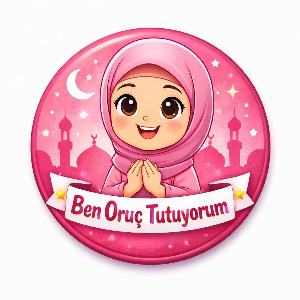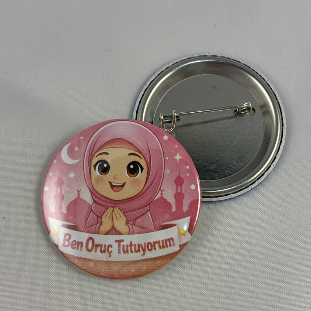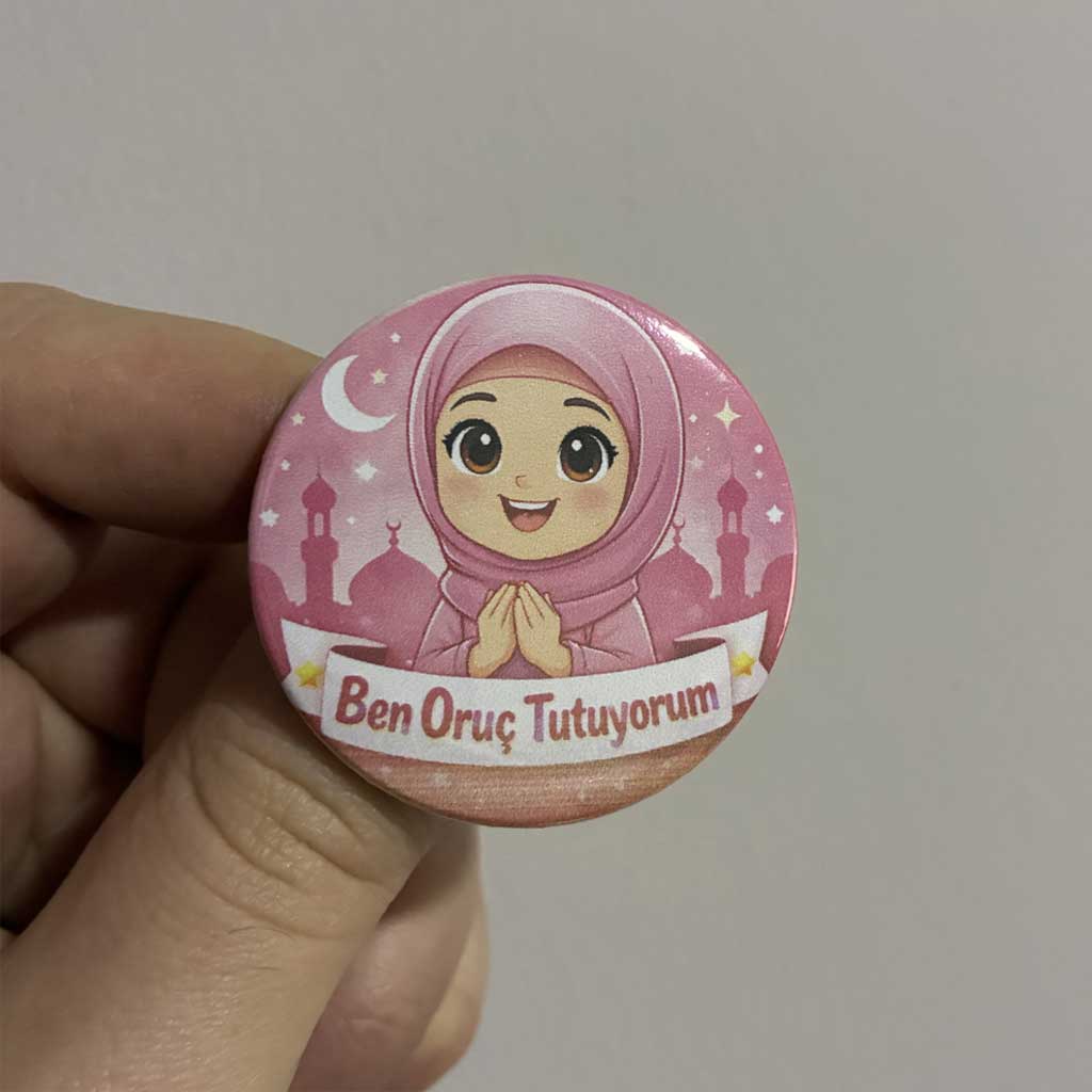 Bu ben oruç tutuyorum kız rozet modeli, dayanıklı metal gövde üzerine üretilir ve ön yüzeyinde parlak koruyucu kaplama bulunur. Bu kaplama, baskının canlı görünmesini sağlar ve çizilmelere karşı ekstra dayanıklılık sunar. Tesettürlü Ramazan temalı tasarım, çocukların ilgisini çekecek renkler ve figürler ile hazırlanmıştır.