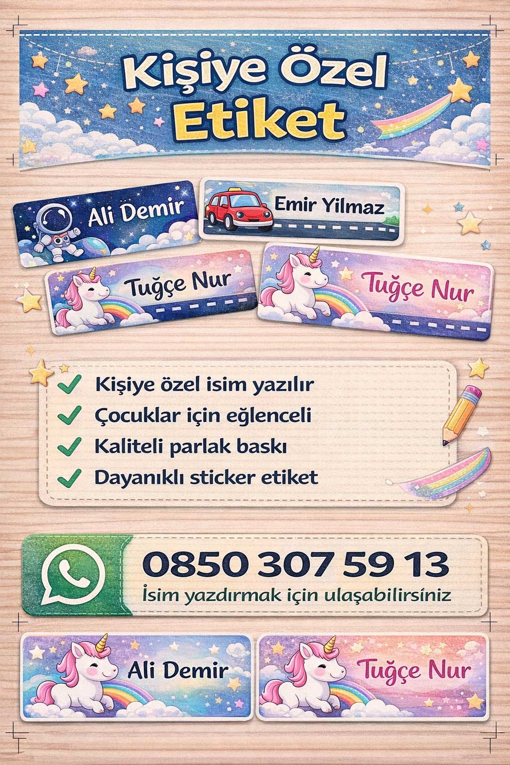 Kişiye özel okul etiketi 230 adet seti, çocukların okul eşyalarını düzenli tutmak ve karışıklığı önlemek için özel olarak hazırlanmış pratik bir çözümdür. İsim yazılı stickerlar sayesinde defter, kalem, kitap, suluk, beslenme kutusu ve diğer okul eşyaları kolayca ayırt edilebilir. Özellikle okul döneminde kaybolan veya karışan eşyalar için bu etiketler büyük kolaylık sağlar.