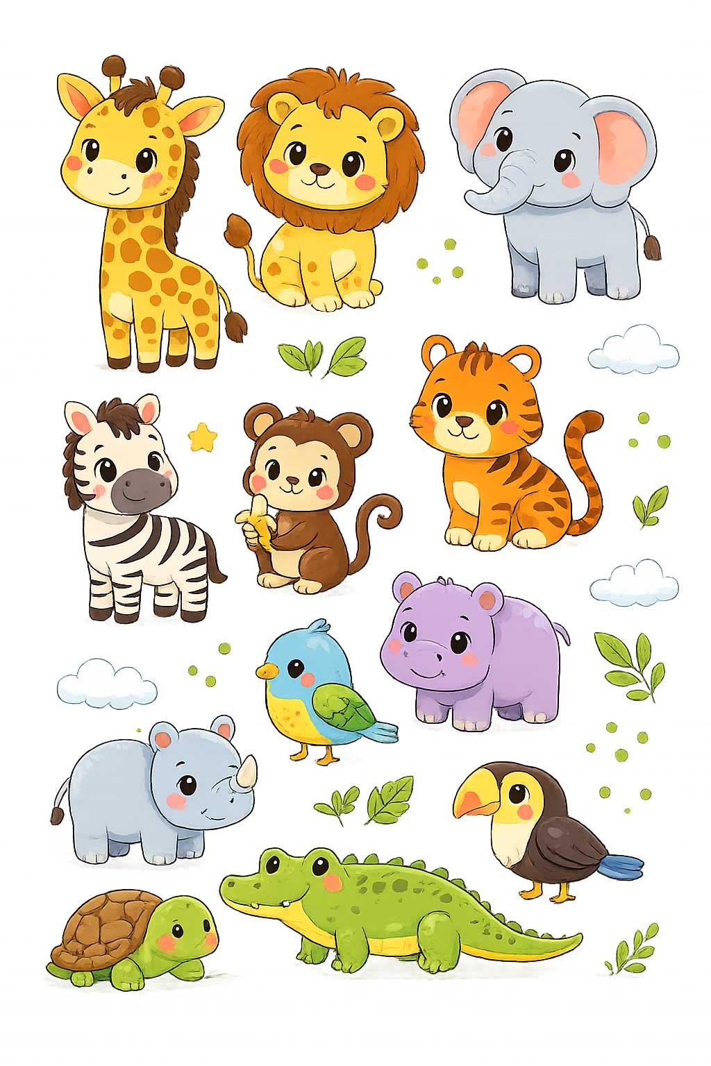 Safari hayvanları duvar sticker seti, çocuk odalarına renkli ve eğlenceli bir atmosfer kazandırmak için özel olarak tasarlanmış dekoratif bir üründür. 12 adet büyük figürden oluşan bu set, çocukların hayal dünyasını zenginleştirirken odalara canlı ve sevimli bir görünüm kazandırır. Safari temalı hayvan figürleri sayesinde çocuk odaları daha eğlenceli ve sıcak bir ortama dönüşür.