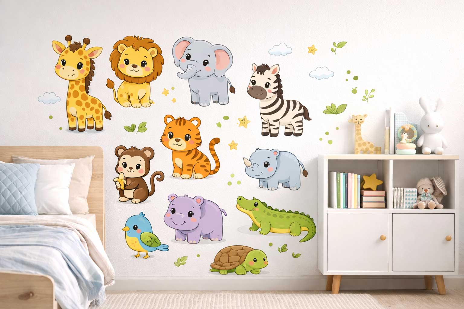 Safari hayvanları duvar sticker seti, çocuk odası dekorasyonunda pratik ve ekonomik bir çözüm sunar. Boya veya duvar kağıdı gibi kalıcı işlemlere gerek kalmadan odanın görünümünü tamamen değiştirebilir. Kolay uygulanabilir yapısı sayesinde herkes tarafından rahatlıkla kullanılabilir.